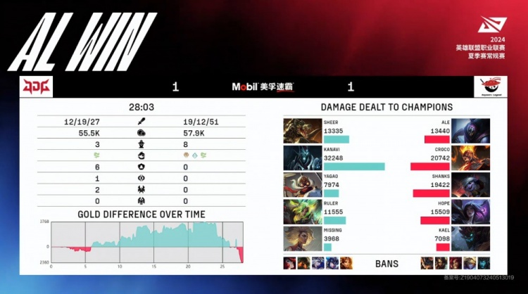 【20:05】Lucian wird im Bot-Lane erwischt, und JD Gaming gewinnt den Kampf 1-2. JD Gaming erwischt dann MF im Fluss. Braum wird getötet, aber JD Gaming gewinnt den Kampf 1-4 und nimmt die Elder Dragon . JD Gaming führt um 6k Gold vorne.