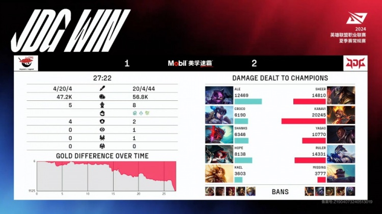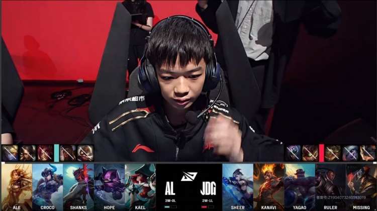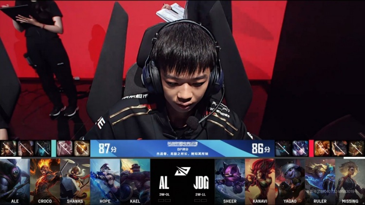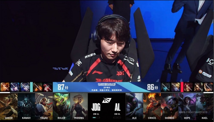 JD Gaming auf der blauen Seite: sheer Renekton, Kanavi Brand, Yagao Corki, Ruler Ezreal, MISSING Karma