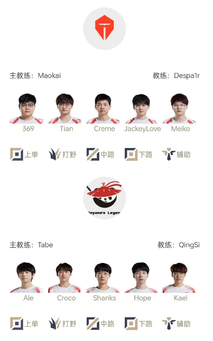 Anyone's Legend vs Top Esports Startaufstellung bekannt gegeben: Ale trifft auf 369 , Shanks trifft auf Creme , Hope konfrontiert JackeyLove