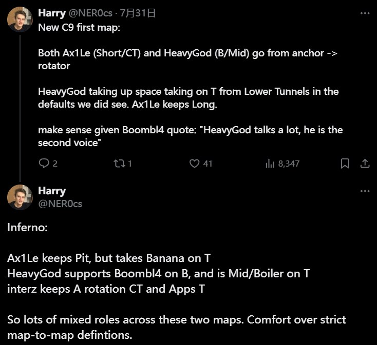 En cuanto a los roles clave de los jugadores, basados en los partidos actuales, la división de trabajo de C9 no tiene problemas significativos, lo cual es una buena noticia. En Dust2, Ax1Le (corto/sitio A en el lado CT) y HeavyGod (sitio B/medio) han pasado de ser jugadores de sitio principal a rotadores. HeavyGod se posiciona en el sitio B en el lado T para crear espacio para el equipo, mientras que Ax1Le hace ruido en A largo. HeavyGod ya puede considerarse el segundo cerebro de este C9.