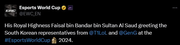 En la E-sports World Cup de 2024, Su Alteza Real el príncipe Faisal bin Bandar bin Sultan Al-Saud dio una calurosa bienvenida a los representantes de T1 y Generation Gaming , quienes son de South Korea .