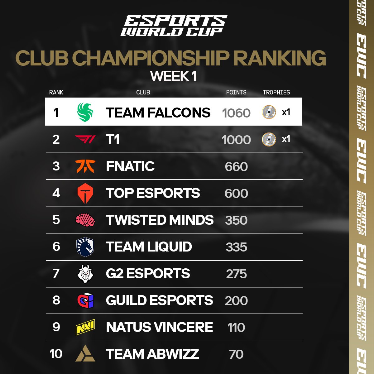 El 8 de julio, la cuenta oficial de Twitter de la Copa Mundial de E-Sports publicó las clasificaciones de los equipos para la primera semana, con Team Falcons ocupando actualmente el primer lugar, mientras que T1 se encuentra temporalmente en segundo lugar.