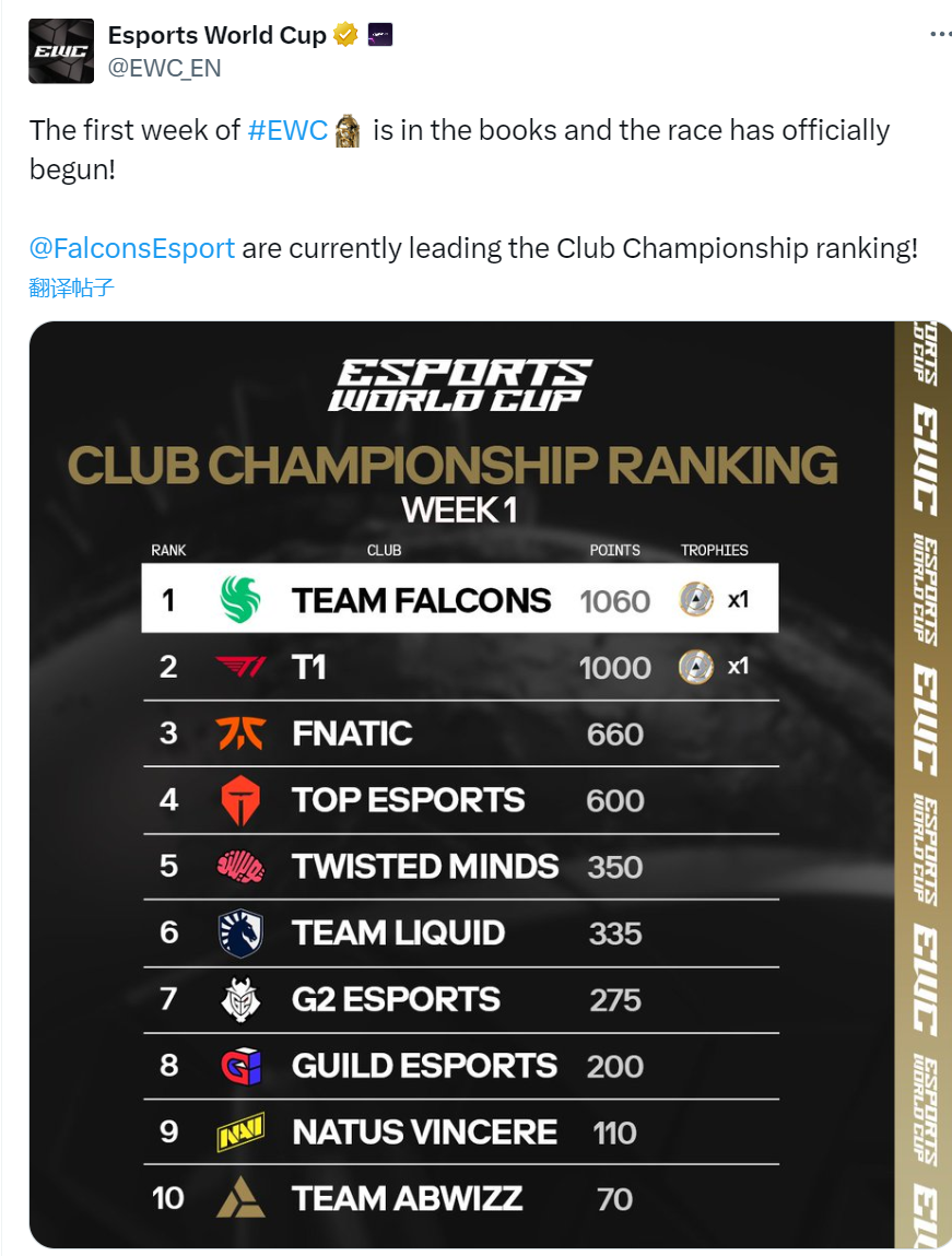 EWC Twitter oficial publicó las clasificaciones de los equipos para la primera semana: T1 actualmente en segundo lugar