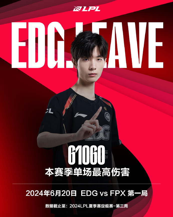 Pemain bot EDward Gaming Leave mencapai output sebesar 61060 dengan damage share 46.9% dalam pertandingan antara EDward Gaming dan FunPlus Phoenix minggu ini, mencetak rekor baru untuk damage dalam satu pertandingan musim ini.