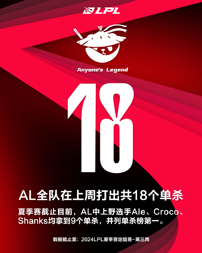 Tim AL mencapai total 18 solo kill minggu lalu. Hingga saat ini di musim panas, pemain top, jungle, dan mid AL Ale , Croco , dan Shanks semuanya telah mencapai 9 solo kill, menduduki peringkat pertama di peringkat solo kill.