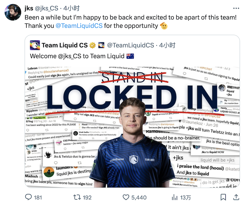 Today, Liquid officially announced the signing of Justin Savage, known as jks, as the fifth member of the team. Subsequently, Liquid's teammates welcomed jks on social media.