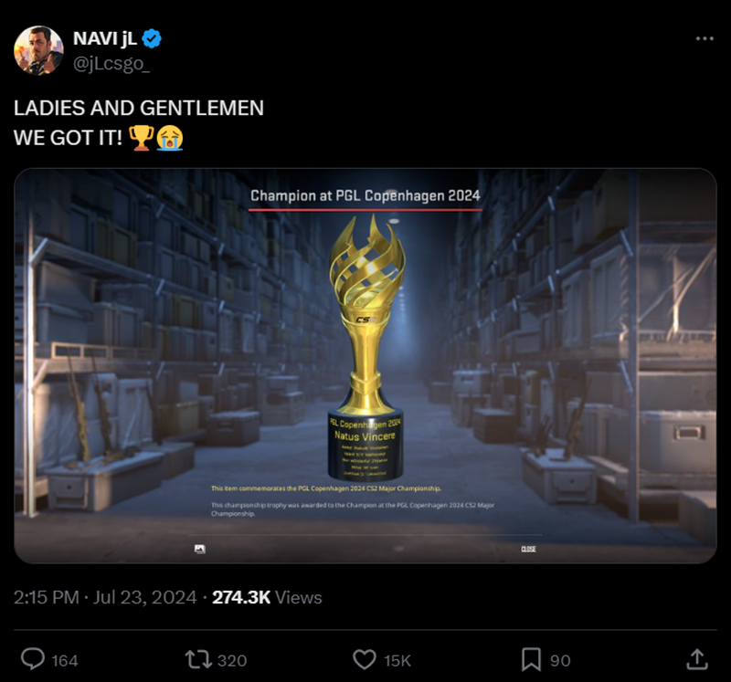 This is not only a personal honor but also a team achievement. You have to put in personal effort and have the corresponding team spirit to win the championship trophy. I just didn't expect to achieve my goal so quickly, considering it's only been three years since I entered the CS scene. I initially expected it to take 6-7 years because many legendary players haven't won a Major championship yet. My achievement is really crazy, and it motivates me to keep moving forward.