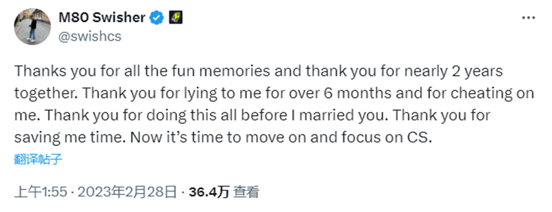Swisher : “Thank you for the wonderful memories, thank you for being with me for almost two years. Thank you for lying to me for more than half a year, thank you for cheating on me, thank you for doing all this before marrying me. Thank you for saving me time, now let's focus back on CS.”