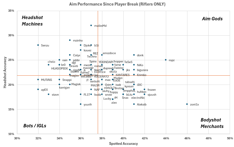 Recently, a CSer compiled the shooting skills of active main pro players, with the horizontal axis representing aiming accuracy and the vertical axis representing headshot accuracy. The four quadrants are labeled as aiming gods, headshot machines, BOT/commanders, and body shot enthusiasts.
