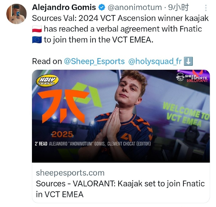 According to media person Alejandro Gomis, 2024 EMEA Promotion Tournament Champion member kaajak has reached a verbal agreement with Fnatic, where he mainly plays the duelist role.