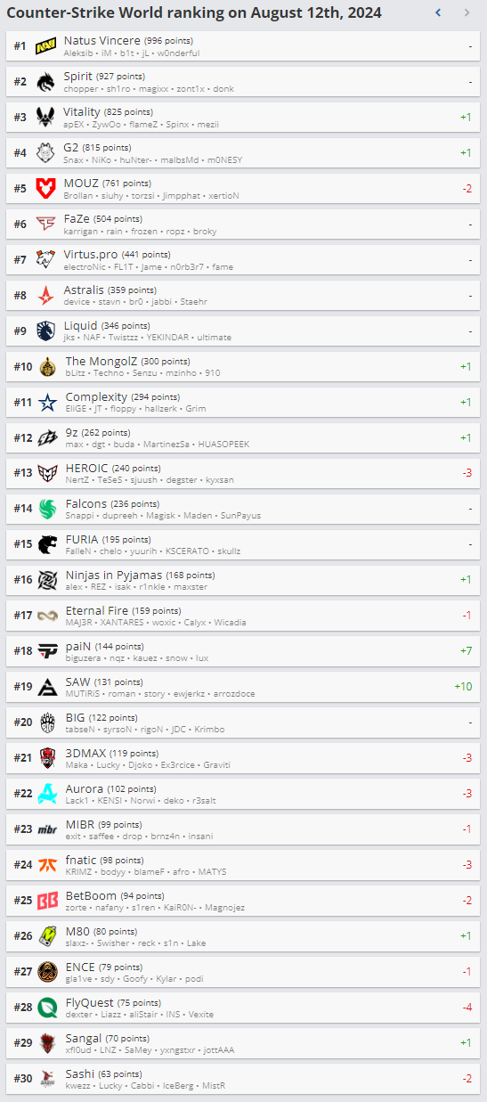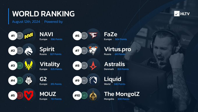 В топ-1-10 командах, Natus Vincere остается первой. MOUZ опустилась на пятое место, поэтому Vitality и G2 немного поднялись в рейтинге. Кроме того, монгольская команда также поднялась на одно место и теперь занимает десятое место.