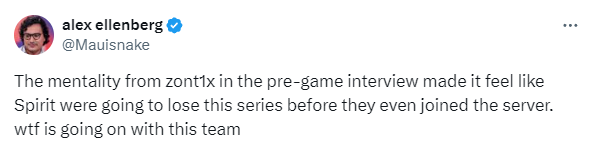 “ Zont1x thái độ trong cuộc phỏng vấn trước trận đấu đã tạo ấn tượng rằng Spirit sẽ thua ngay cả trước khi họ bắt đầu chơi. Có chuyện gì với đội này vậy?”