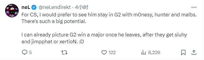 neL: "Từ góc nhìn của cuộc thi, tôi thà thấy anh ấy ở lại G2 với m0NESY , huNter-, malbsMd , có vẻ như đội hình này có rất nhiều tiềm năng.