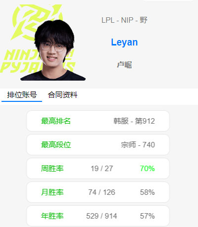 7月22日,此前多方消息显示,Leyan将加入LPL登峰组NIP战队,随后OBGG已做出更改,将Leyan列为NIP打野。