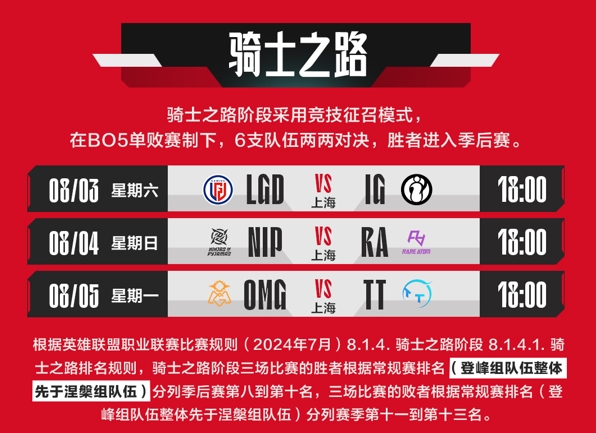 2024LPL夏季赛骑士之路8月3日正式开启,本阶段采用竞技征召模式,在BO5单败赛制下,6支队伍两两对决,胜者进入季后赛。