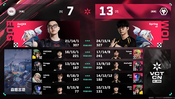 下半场手枪局WOL主动出击B区前压与EDG如出一辙取得优势,人数劣势的EDG手枪局失利。经济局的Smoggy重拳出击依靠队友吸引,冲破电梯房拿到四杀翻盘成功。长枪局EDG进攻A2,WOL重兵把守拦截进攻拿到第五分。CHICHOO正义双杀宣布EDG拿到赛点。赛点局WOL4B重防追回一分。手握6个赛点的EDG最终稳稳拿下图一。