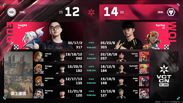 第十五局康康在A区拿到首杀,狼队不甘示弱抱团rushA,SiuFatBB三杀带领队伍鸟枪换炮。次局SiuFatBB再次关键三杀将对手送入经济局,狼队拿到11分。第十七局狼队第二时间提速A区,EDG中路信息拉满加持B区前压重防A区,包点交叉火力追回一分。狼队不慌不忙慢攻A区,SiuFatBB精彩发挥帮助队伍拿到赛点。赛点局nobody大招连收两人,EDG稳扎稳打扳回一个赛点。Spring飓刃开路拿到B区首杀,队友跟上补枪拿下比赛。