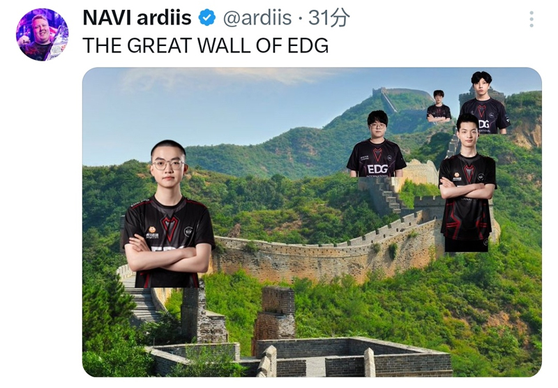 在EDG再次突破历史,晋级首尔冠军赛的总决赛之后,幽默胖子ardiis在推特上直接P了一张EDG长城图!