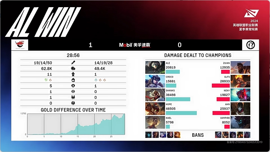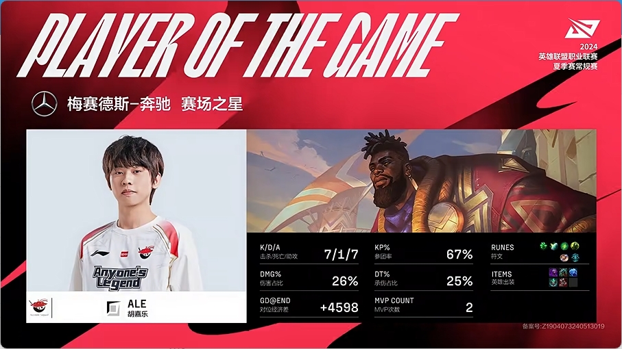 第27分鐘, Anyone's Legend 以五人之力推進最後一條路。憑藉龐大的經濟優勢, Anyone's Legend 均勻地推進並取得多次擊殺,以一勝全盛局結束遊戲。