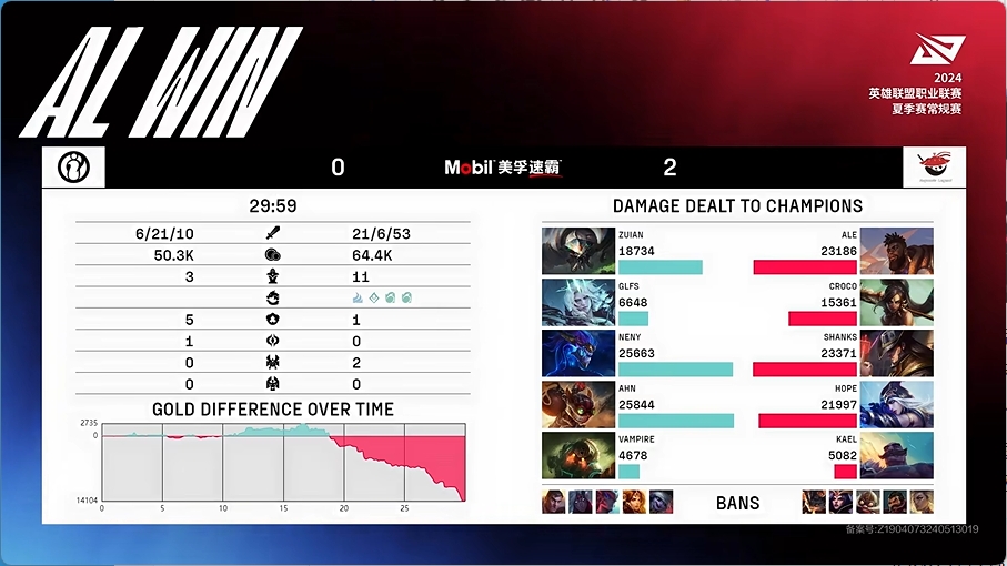 第29分鐘, Anyone's Legend 的三名成員推動下路,而中路和上路在敵方基地前進行2v5戰鬥。以巨大優勢, Anyone's Legend 以0換4的交易完全擊敗了 Invictus Gaming ,獲得了勝利。